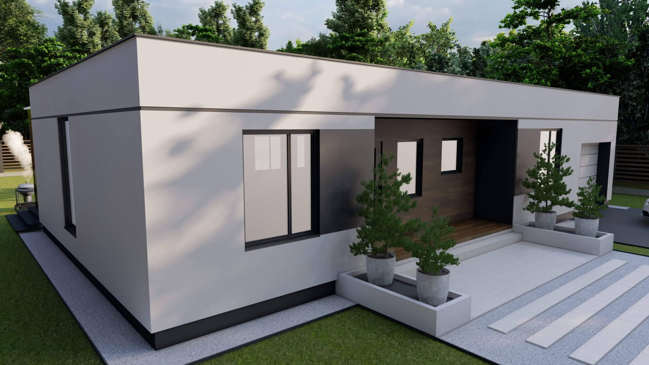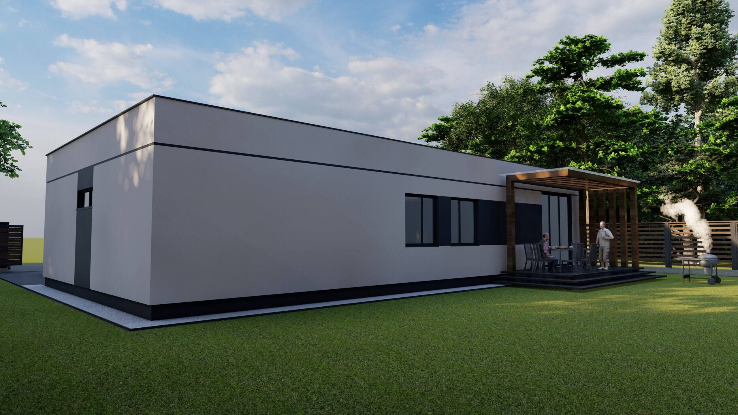 Во все комплектации домов FLAT входит 100% наружная отделка фасада, полностью рабочая кровля с гарантией 10 лет и «мягкая» отмостка шириной 1м. Так же предусмотрено крыльцо при входе в дом и главная особенность линейки FLAT это Пергола адаптированная под Сибирские реалии проживания также включенная в базовую комплектацию.